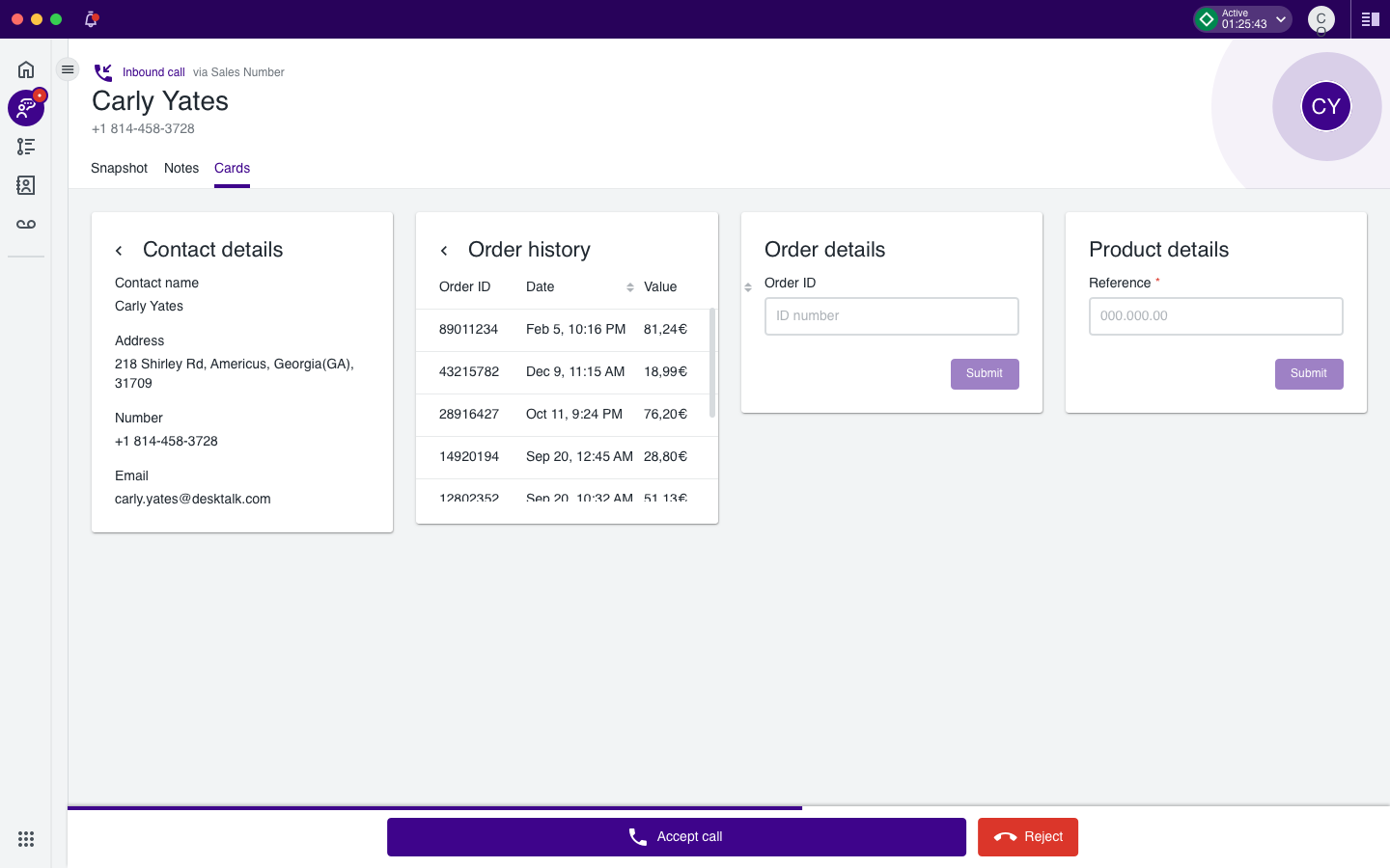 This canvas appears as a tab during a call (inbound or outbound) on the Conversations app.