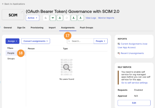 Finally, go to Assignments [17], click on the People section [18], and use the search field to select the people or groups to be provisioned in SCIM.
